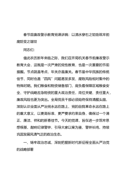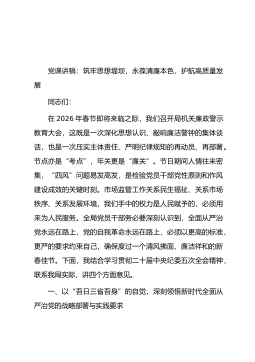 春节前廉政警示教育党课讲稿:以滴水穿石之韧劲筑牢拒腐防变之堤坝同志们:值此农历新年来临之际,我们召开局机关春节前廉政警示教育大会,这既是一次严肃的党性教育,也是一次重要的节前提醒。节点就是考点,年关亦是廉关。春节是中华民族的传统佳节,同时也是“四风”问题易发多发、腐败风险相对集中的特殊时期。我们粮食和物资储备部门,肩负着保障区域粮食安全、守护战略应急物资的重大政治责任,岗位关键、责任重大,廉政风险也更为突出。全局党员干部必须始终保持清醒头脑,深刻认识全面从严治党永远在路上、党的自我革命永远在路上的重大意义,以更高标准、更严要求约束自身,确保过一个清正、廉洁、祥和的新春佳节。今天的党课,旨在进一...