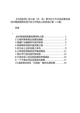 【交流发言】浙江县(市、区)委书记工作交流会暨全省经济稳进提质攻坚行动工作例会上的发言汇编(10篇)目录1.走好县域高质量发展特色之路...............................12.以城市焕新跑出发展加速度................................33.做强产业集群抓升级开新局................................54.探索绿色低碳共富发展之路................................75.在办会上出彩发展上争先...................................96.以有效投资推进经济...