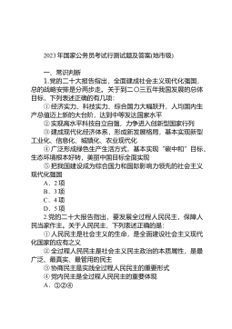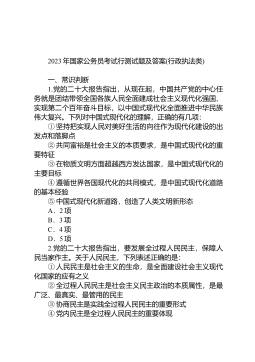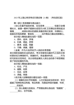 2023年上海公务员考试行测试卷(A卷)(考生回忆版) 第一部分言语理解与表达能力1.初心在最开始的时候,往往简单________,但是它会慢慢长大,就像一颗种子能够长成苍天大树,又仿佛站在零的起点慢慢________成很长很长的道路,到最后我们发现,所谓初心,就是在所有的愿望、誓言和________当中离自己最近的那颗心。依次填入横线处最恰当的一项是:A.质朴,延伸,梦境B.朴素,绵延,梦想C.素净,延展,想象D.宁静,绵展,理想2.金属,作为大自然给予人类的珍贵馈赠,________着人类文明的发展和社会的进步。考古学家将石器时代之后的文明时期命名为青铜时代、铁器时代,将金属材料的____...