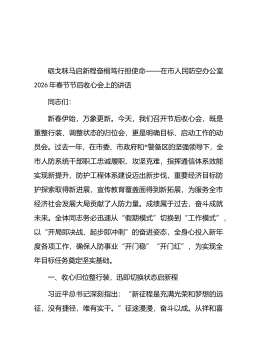 砺戈秣马启新程奋楫笃行担使命——在市人民防空办公室2026年春节节后收心会上的讲话同志们:新春伊始,万象更新。今天,我们召开节后收心会,既是重整行装、调整状态的归位会,更是明确目标、启动工作的动员会。过去一年,在市委、市政府和*警备区的坚强领导下,全市人防系统干部职工忠诚履职、攻坚克难,指挥通信体系效能实现新提升,防护工程体系建设迈出新步伐,重要经济目标防护探索取得新进展,宣传教育覆盖面得到新拓展,为服务全市经济社会发展大局贡献了人防力量。成绩属于过去,奋斗成就未来。全体同志务必迅速从“假期模式”切换到“工作模式”,以“开局即决战、起步即冲刺”的奋进姿态,全身心投入新年度各项工作,确保人防事业...
