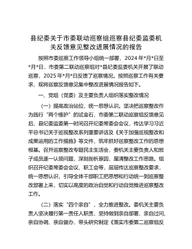 县纪委关于市委联动巡察组巡察县纪委监委机关反馈意见整改进展情况的报告按照市委巡察工作领导小组统一部署,2024年*月*日至*月*日,市委第二联动巡察组对*县纪委监委机关开展了联动巡察,2025年*月*日反馈了巡察情况。按照巡察工作有关要求,现将巡察反馈意见集中整改进展情况报告如下。一、党组(党委)及主要负责人组织落实整改情况(一)提高政治站位,统一思想认识。坚决把巡察整改作为践行“两个维护”的试金石,市委第二联动巡察组反馈意见后,县纪委监委第一时间召开纪委常委会会议,传达学习习近平总书记关于巡视整改系列重要讲话及《关于加强巡视整改和成果运用的工作措施》等文件,筑牢抓好巡察整改工作的思想根基。召...
