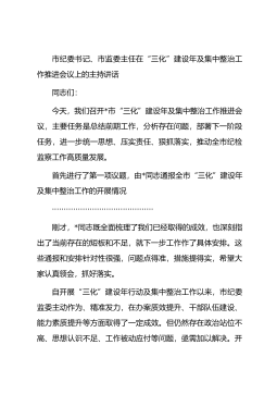 市纪委书记、市监委主任在“三化”建设年及集中整治工作推进会议上的主持讲话同志们:今天,我们召开*市“三化”建设年及集中整治工作推进会议,主要任务是总结前期工作,分析存在问题,部署下一阶段任务,进一步统一思想、压实责任、狠抓落实,推动全市纪检监察工作高质量发展。首先进行了第一项议题,由*同志通报全市“三化”建设年及集中整治工作的开展情况···········································刚才,*同志既全面梳理了我们已经取得的成效,也深刻指出了当前存在的短板和不足,就下一步工作作了具体安排。这些通报和安排针对性很强,问题点得准,措施提得实,希望大家认真领会,抓好落...