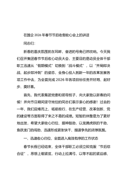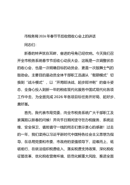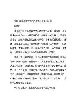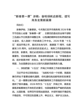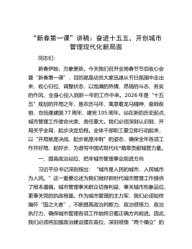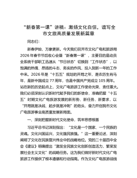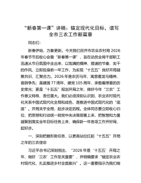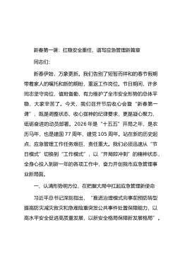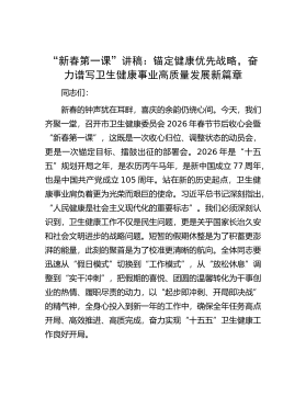 “新春第一课”讲稿:锚定健康优先战略,奋力谱写卫生健康事业高质量发展新篇章同志们:新春的钟声犹在耳畔,喜庆的余韵仍绕心间。今天,我们齐聚一堂,召开市卫生健康委员会2026年春节节后收心会暨“新春第一课”,这既是一次收心归位、调整状态的动员会,更是一次锚定目标、擂鼓出征的部署会。2026年是“十五五”规划开局之年,是农历丙午马年,是新中国成立77周年,也是中国共产党成立105周年。站在新的历史起点,卫生健康事业肩负着更为光荣而艰巨的使命。习近平总书记深刻指出,“人民健康是社会主义现代化的重要标志”。我们必须深刻认识到,卫生健康工作不仅是民生问题,更是关乎国家长治久安和社会文明进步的战略问题。短暂...
