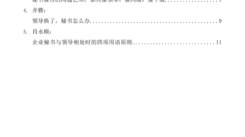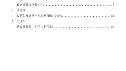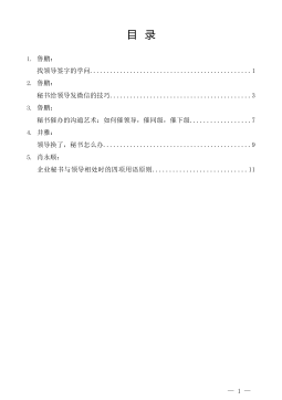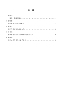 —1—目录1.丁向明:新做秘书的几次失误..............................................12.方晨:当年秘书今体会..................................................33.喻弋:武钢领导谈秘书工作..............................................84.邵晓锋:我是怎样做阿里巴巴集团秘书长的.................................125.李世杰:党政领导秘书们的上班生涯......................................