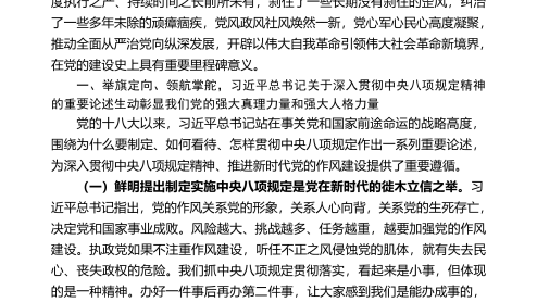 党的十八大以来深入贯彻中央八项规定精神的成效和经验前言党的十八大以来,以习近平同志为核心的党中央不忘初心、牢记使命,以强烈的历史担当和顽强的意志品质,直面党面临的重大风险考验和党内存在的突出问题,总结运用党的百年奋斗历史经验,从制定和落实中央八项规定开局破题,严字当头、刀刃向内,以钉钉子精神纠治“四风”,整治力度之大、制度执行之严、持续时间之长前所未有,刹住了一些长期没有刹住的歪风,纠治了一些多年未除的顽瘴痼疾,党风政风社风焕然一新,党心军心民心高度凝聚,推动全面从严治党向纵深发展,开辟以伟大自我革命引领伟大社会革命新境界,在党的建设史上具有重要里程碑意义。目录举旗定向、领航掌舵,习近平总书记...
