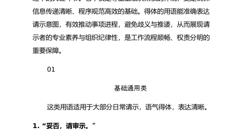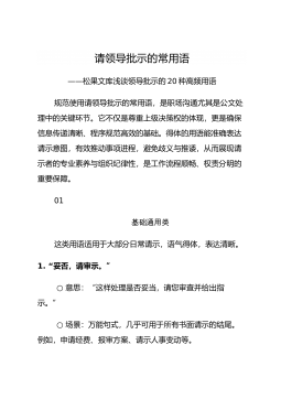 请领导批示的常用语——松果文库浅谈领导批示的20种高频用语规范使用请领导批示的常用语,是职场沟通尤其是公文处理中的关键环节。它不仅是尊重上级决策权的体现,更是确保信息传递清晰、程序规范高效的基础。得体的用语能准确表达请示意图,有效推动事项进程,避免歧义与推诿,从而展现请示者的专业素养与组织纪律性,是工作流程顺畅、权责分明的重要保障。01基础通用类这类用语适用于大部分日常请示,语气得体,表达清晰。1.“妥否,请审示。” ○意思:“这样处理是否妥当,请您审查并给出指示。” ○场景:万能句式,几乎可用于所有书面请示的结尾。例如,申请经费、报审方案、请示人事变动等。2.“当否,请批示。” ○意思:“这...
