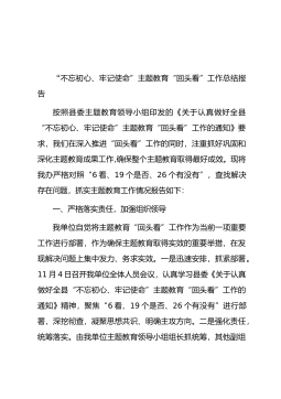 “不忘初心、牢记使命”主题教育“回头看”工作总结报告按照县委主题教育领导小组印发的《关于认真做好全县“不忘初心、牢记使命”主题教育“回头看”工作的通知》要求,我们在深入推进“回头看”工作的同时,注重抓好巩固和深化主题教育成果工作,确保整个主题教育取得最好成效。现将我办严格对照“6看、19个是否、26个有没有”,查找解决存在问题,抓实主题教育工作情况报告如下:一、严格落实责任,加强组织领导我单位自觉将主题教育“回头看”工作作为当前一项重要工作进行部署,作为确保主题教育取得实效的重要举措,在发现解决问题上集中发力、务求实效。一是迅速安排,抓紧部署。11月4日召开我单位全体人员会议,认真学习县委《关...