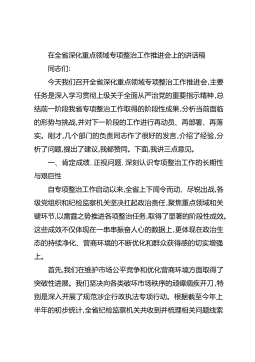 在全省深化重点领域专项整治工作推进会上的讲话稿同志们:今天我们召开全省深化重点领域专项整治工作推进会,主要任务是深入学习贯彻上级关于全面从严治党的重要指示精神,总结前一阶段我省专项整治工作取得的阶段性成果,分析当前面临的形势与挑战,并对下一阶段的工作进行再动员、再部署、再落实。刚才,几个部门的负责同志作了很好的发言,介绍了经验,分析了问题,提出了建议,我都赞同。下面,我讲三点意见。一、肯定成绩,正视问题,深刻认识专项整治工作的长期性与艰巨性自专项整治工作启动以来,全省上下闻令而动、尽锐出战,各级党组织和纪检监察机关坚决扛起政治责任,聚焦重点领域和关键环节,以雷霆之势推进各项整治任务,取得了显著...