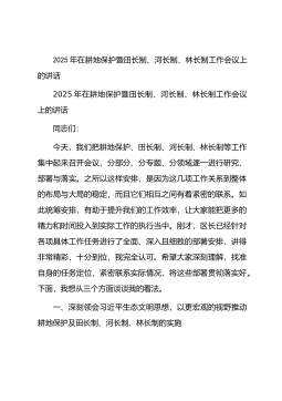 2025年在耕地保护暨田长制、河长制、林长制工作会议上的讲话2025年在耕地保护暨田长制、河长制、林长制工作会议上的讲话同志们:今天,我们把耕地保护、田长制、河长制、林长制等工作集中起来召开会议,分部分、分专题、分领域逐一进行研究、部署与落实。之所以这样安排,是因为这几项工作关系到整体的布局与大局的稳定,而且它们相互之间有着紧密的联系。如此统筹安排,有助于提升我们的工作效率,让大家能把更多的精力和时间投入到实际工作的执行当中。刚才,区长已经针对各项具体工作任务进行了全面、深入且细致的部署安排,讲得非常精彩、十分到位,我完全认可。希望大家深刻理解,找准自身的任务定位,紧密联系实际情况,将这些部署...
