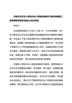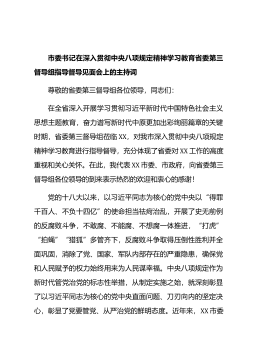 市委书记在深入贯彻中央八项规定精神学习教育省委第三督导组指导督导见面会上的主持词尊敬的省委第三督导组各位领导,同志们:在全省深入开展学习贯彻习近平新时代中国特色社会主义思想主题教育,奋力谱写新时代中原更加出彩绚丽篇章的关键时期,省委第三督导组莅临XX,对我市深入贯彻中央八项规定精神学习教育进行指导督导,充分体现了省委对XX工作的高度重视和关心关怀。在此,我代表XX市委、市政府,向省委第三督导组各位领导的到来表示热烈的欢迎和衷心的感谢!党的十八大以来,以习近平同志为核心的党中央以“得罪千百人、不负十四亿”的使命担当祛疴治乱,开展了史无前例的反腐败斗争,不敢腐、不能腐、不想腐一体推进,“打虎”“拍...