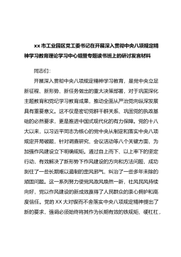 xx市工业园区党工委书记在开展深入贯彻中央八项规定精神学习教育理论学习中心组暨专题读书班上的研讨发言材料同志们:开展深入贯彻中央八项规定精神学习教育,是党中央立足新征程、新形势、新任务做出的重大决策部署,对于巩固深化主题教育和党纪学习教育成果,推动全面从严治党向纵深发展具有重要意义。这不仅是密切党群干群关系、巩固党的执政基础的必然要求,更是推进中国式现代化的有力保障。党的十八大以来,以习近平同志为核心的党中央从制定和落实中央八项规定开局破题,针对调查研究、会议活动等八个关键方面,为加强作风建设立下明确规矩。通过自上而下、以上率下的坚定行动,有效解决了新形势下作风建设的方向和方法问题,成功刹住了...