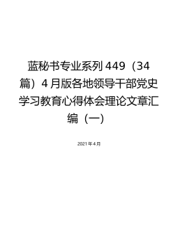 蓝秘书专业系列449(34篇)4月版各地领导干部党史学习教育心得体会理论文章汇编(一)2021年4月目录1.上海市副市长、市公安局党委书记、局长舒庆:从党史中汲取智慧力量谱写上海公安事业新篇章12.青海师范大学习近平新时代中国特色社会主义思想研究中心郭连云:不断开创党史学习教育新格局53.江西科技师范大学党委书记李红勇:将党史学习教育贯穿立德树人全过程94.西安市委党校科学社会主义教研部副教授任孟娥:党史学习教育要抓住“四个观”125.张亚勇:从四个维度把握党史学习重点146.中国航空工业集团有限公司党组书记、董事长谭瑞松:从党史中汲取建设新时代航空强国的力量187.中国铁路郑州局集团有限公司...