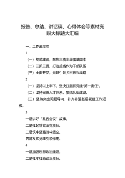 报告、总结、讲话稿、心得体会等素材亮眼大标题大汇编(987条1.5万字)1.高举新时代中国特色社会主义思想伟大旗帜聚焦重点攻坚突破奋力冲刺全年目标以实际行动迎接党的二十大胜利召开2.牢记总书记嘱托加快建设现代化国际城市奋进新征程建功新时代把xx建设得更加美好更好造福人民群众3.与时代同呼吸与城市共发展在高质量建设践行新发展理念的公园城市示范区的进程中书写青春篇章4.牢记青年使命勇担时代责任在推进中医药传承创新发展的春天里绽放出更加绚丽多彩的青春之花5.坚持党对人大工作的全面领导践行和发展全过程人民民主推动新时代人大工作高质量发展6.坚持不懈把全面从严治党向纵深推进为全面建设社会主义现代化美丽新...