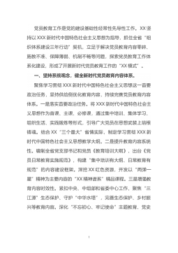党员教育工作是党的建设基础性经常性先导性工作。XX坚持以XXX新时代中国特色社会主义思想为指导,抓住全省“组织体系建设三年行动”契机,立足于解决党员教育内容零碎、施教不准、保障薄弱、机制不畅等问题,探索党员教育工作体系化建设,形成了开展新时代党员教育工作的“XX模式”。一、坚持系统观念,健全新时代党员教育内容体系。聚焦学习贯彻XXX新时代中国特色社会主义思想这一首要政治任务,坚持供给侧优化教育内容,持续完善党员教育内容体系。一是落实首要政治任务。将XXX新时代中国特色社会主义思想作为首课、主课、必修课,通过集中培训、集体学习、组织生活、实践锻炼等形式,引导广大党员在思想武装上培根铸魂。结合XX...