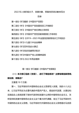 2022年入党积极分子、发展对象、预备党员培训教材范文目录第一部分学习最新《中国共产党章》第二部分学习《中国共产党发展党员工作细则》第三部分学习《中国共产党纪律处分条例》第四部分学习《中国共产党党员教育管理工作条例》第五部分学习《2019—2023年全国党员教育培训工作规划》第六部分学习十九届六中全会精神第七部分学习百年党史大事记第八部分学习党史党建常识知识第九部分学习中国共产党人的精神谱系第十部分学习2022年两会精神第一部分学习最新《中国共产党章程》(一)本次修订后的《党章》,进行了哪些修改?主要有哪些新思想、新论断、新概念?主要是10个方面:第一,习近平新时代中国特色社会主义思想写入党章...