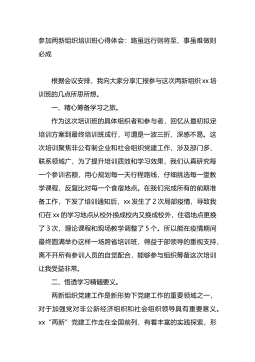 参加两新组织培训班心得体会:路虽远行则将至、事虽难做则必成根据会议安排,我向大家分享汇报参与这次两新组织xx培训班的几点所思所想。一、精心筹备学习之旅。作为这次培训班的具体组织者和参与者,回忆从最初拟定培训方案到最终培训班成行,可谓是一波三折、深感不易。这次培训聚焦非公有制企业和社会组织党建工作,涉及部门多、联系领域广,为了提升培训质效和学习效果,我们认真研究每一个参训名额,用心规划每一天行程路线,仔细挑选每一堂教学课程,反复比对每一个食宿地点。在我们完成所有的前期准备工作,下发了培训通知后,xx发生了2次局部疫情,导致我们在xx的学习地点从校外换成校内又换成校外,住宿地点更换了3次,理论课程...